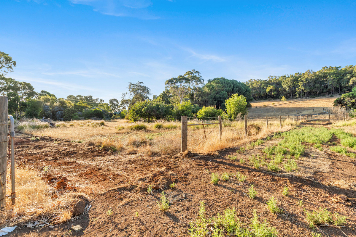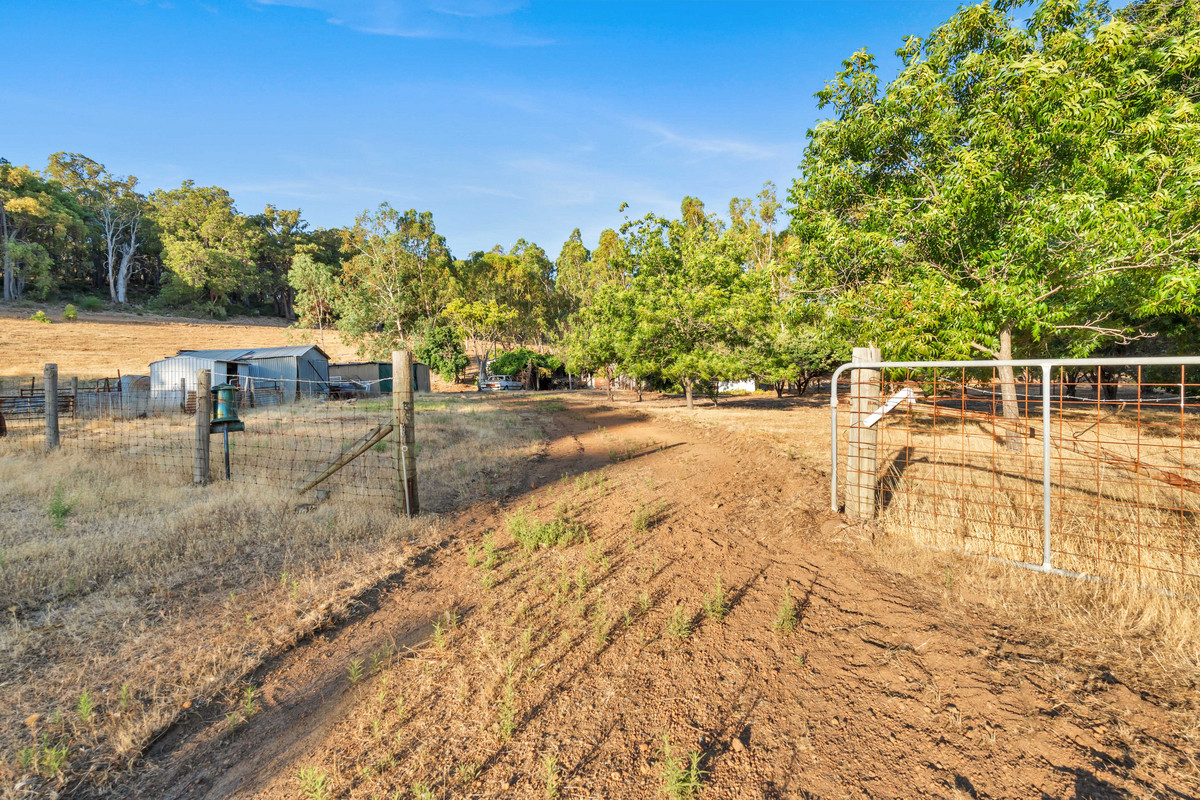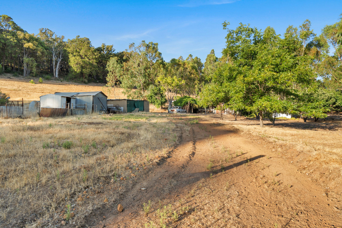 The property features a gently sloping block with a large, cleared and mostly flat lower section. A standout feature of the property is the natural soak, which holds water year-round. Currently on the property is an existing structure described as a two-bedroom, one-bathroom dwelling, along with an external bathroom and laundry. This structure may be retained and extended, renovated, or removed entirely to make way for a brand-new home. The property also features scattered fruit trees, fenced paddocks and multiple sheds.