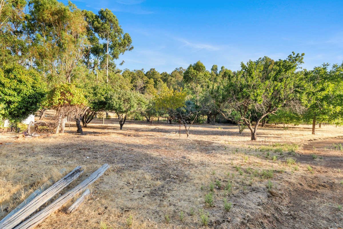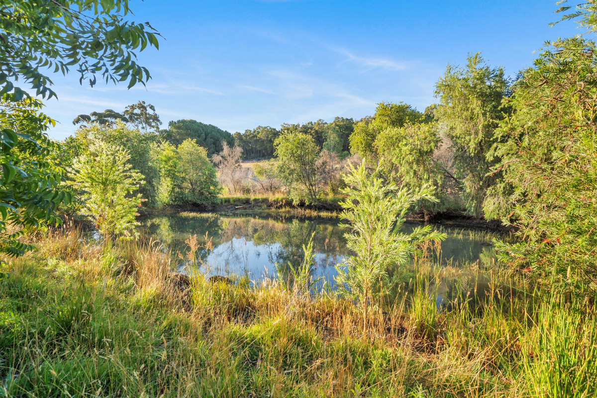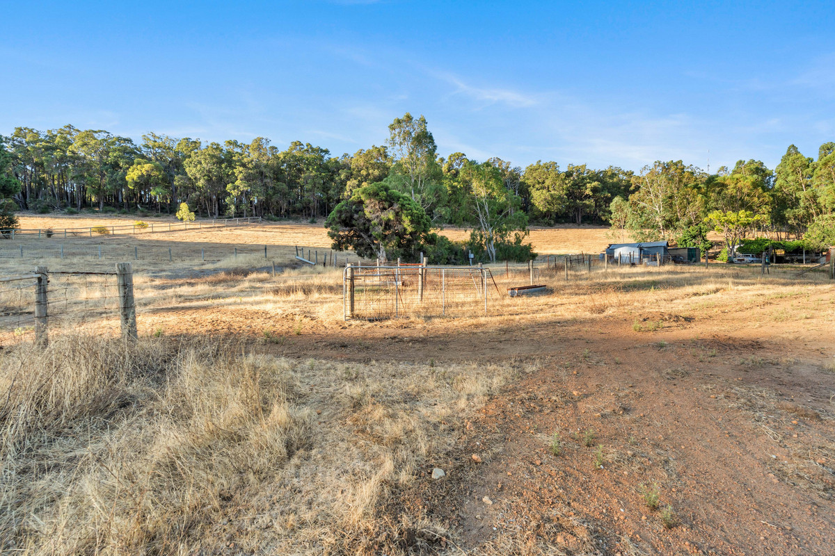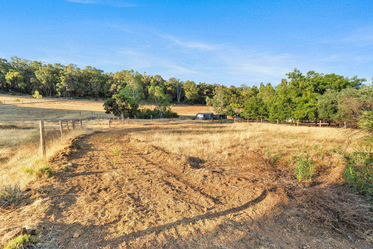 The property features a gently sloping block with a large, cleared and mostly flat lower section. A standout feature of the property is the natural soak, which holds water year-round. Currently on the property is an existing structure described as a two-bedroom, one-bathroom dwelling, along with an external bathroom and laundry. This structure may be retained and extended, renovated, or removed entirely to make way for a brand-new home. The property also features scattered fruit trees, fenced paddocks and multiple sheds.
